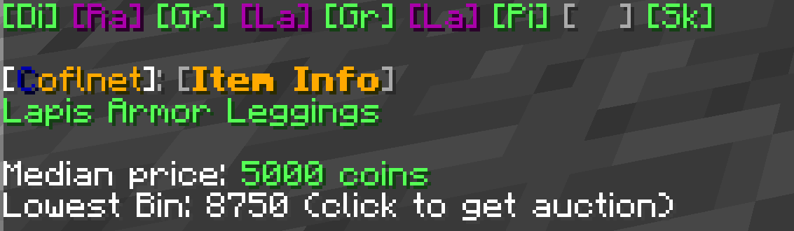 ➡️ Added /cofl iteminfo it allows you to see data about a given item. For example the matching lowest bin to the Lbin value displayed in the lore.