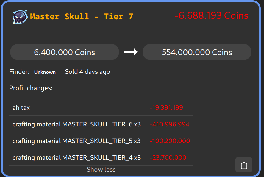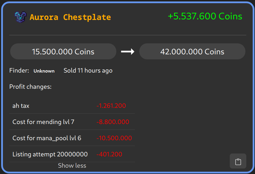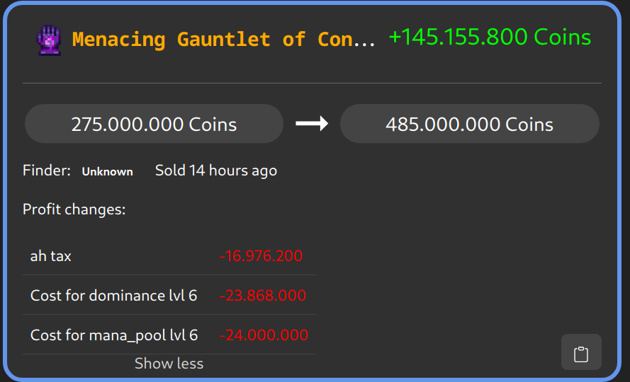 ➡️ Connection ids are now valid for 1 hour of the connection at which point a new connection will be simulated. If you encounter an error please run /cofl report as the issue is harder to find by the original connection id. This is done as connections are now relatively long and stable so they grew so big that I can’t load them in full anymore.
