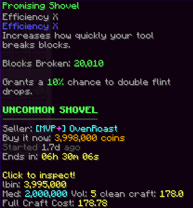 Example of usage, values as seen below, an Aspect of the End gets listed with Sharpness 7 (~110m) the clean item value is ~1m, the target price would be 100m, if the starting bid is 80m it would show as 18m profit (minus ah tax)