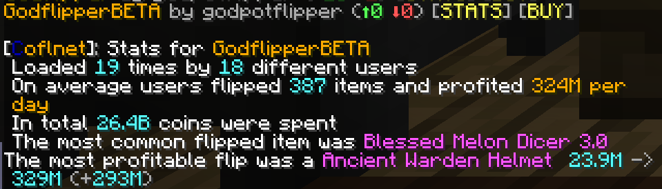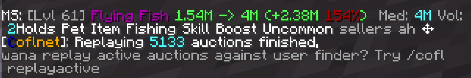 ➡️ Added /cofl replayflips <hours> as suggested by @thompie__. It allows you to replay flips to test your config. Note that the amount of flips may crash Minecraft if you replay a lot of hours.
