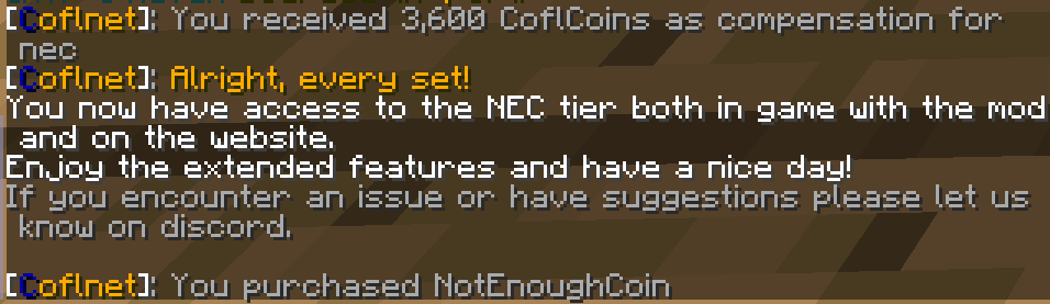 ➡️ Added /cofl nec for any NEC user to claim a year of NotEnoughCoins-tier. It takes in the email it was purchased with.