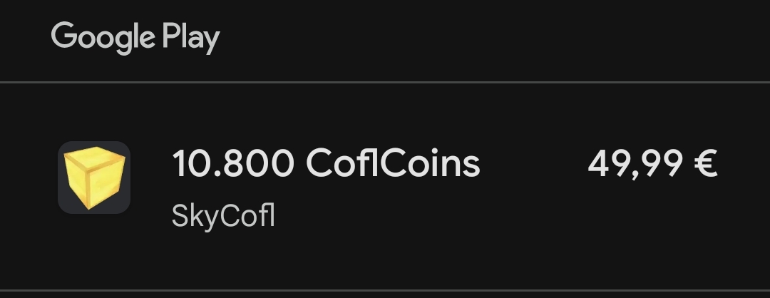 ➡️ Completed integration with google play payments, you can now purchase CoflCoins via all supported payment methods including gift cards or your mobile phone plan. Prices are localized and stay at a fixed rate