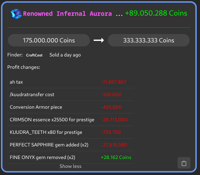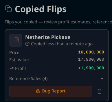 ➡️ Added a new section Copied Flips to DonutSmp auction flips that persists all flips you copied to get resell price and be able to report miss-valuations.